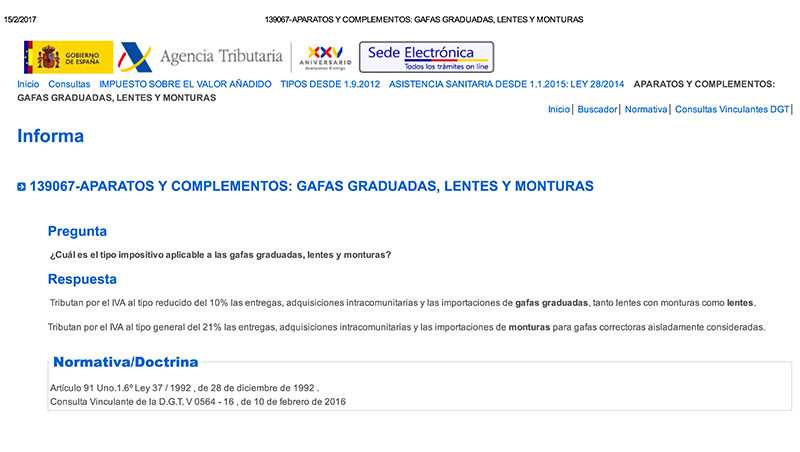 A la vista de esta respuesta que nos da la Agencia Tributaria, como a cualquiera que realice la misma pregunta relativa al tipo impositivo del IVA aplicable a las monturas a través del Programa Informa, hay que decir que el sistema ha sido actualizado y pone que desde el 1-1-2015 las monturas deben tributar al 21%. Esta información de la Agencia Tributaria puede ser consultada por cualquiera de nosotros online en su web.