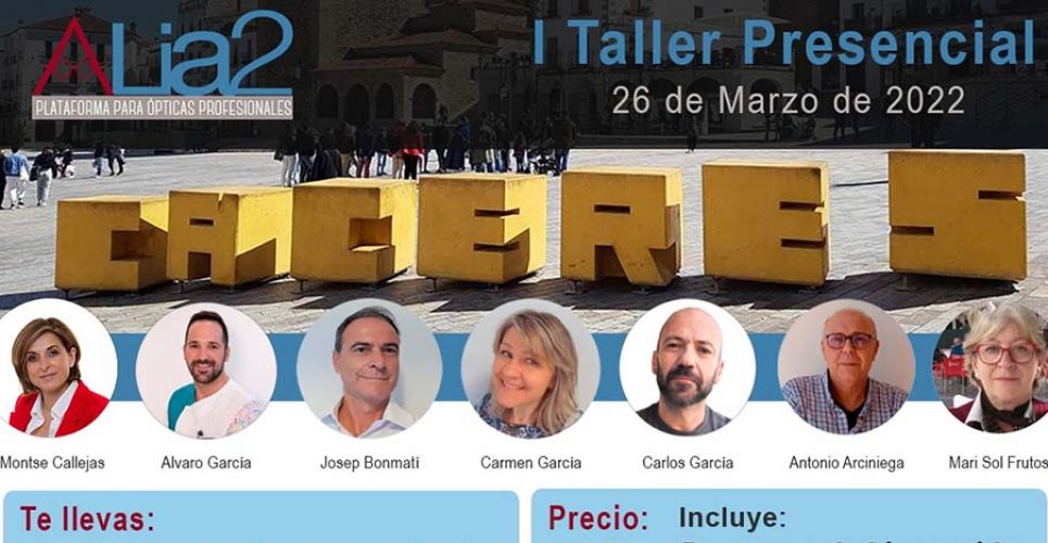 Alia2 está ultimando los preparativos del Taller Presencial que organiza para el óptico profesional el próximo 26 de marzo. La jornada tendrá lugar en Cáceres y se desarrollará a parir de la 9 de la mañana con un desayuno de bienvenida seguido de un taller formativo de 10 a 14 horas, un almuerzo posterior y un taller creativo de 16 a 20 horas.