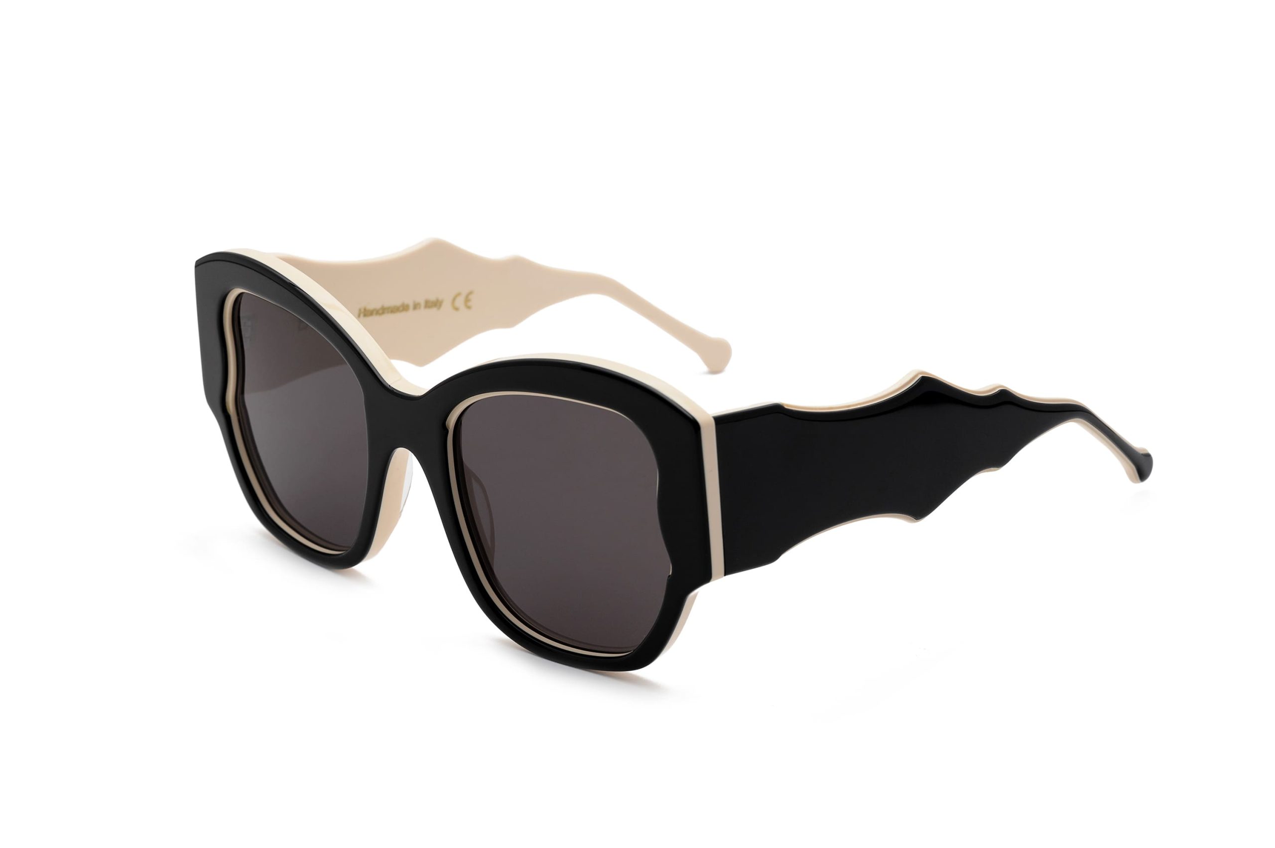 AnnAcronista es una gafa de sol estilo mariposa, en acetato negro, en contraste con una placa beige. Líneas casi imperceptibles permiten que el color subyacente aflore en el perfil inmediatamente anterior a la lente y en el lateral, donde una gruesa varilla de forma irregular y puntiaguda contrasta con la delicadeza del frontal. La combinación de negro y beige hace referencia a los colores del papel impreso sobre el que fluían sus palabras, mientras que la forma de mariposa, grácil y flotante, es una invitación a la libertad de expresión, sin límites ni restricciones.
