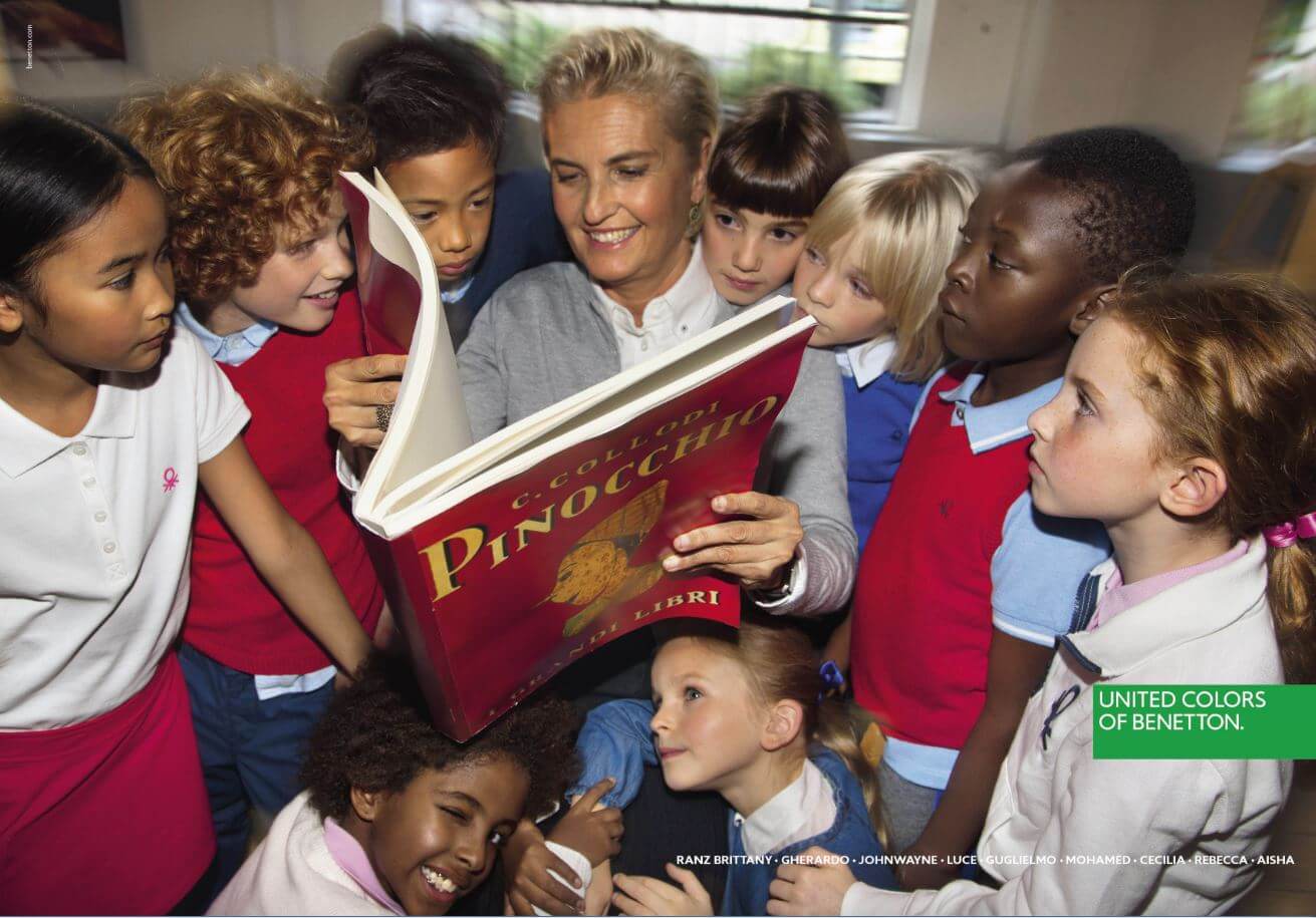Un total de 10 niños – desde Burkina Faso hasta Filipinas, de Italia a Senegal – reunidos en torno a una maestra que lee Pinocho. Absortos. Escuchando.