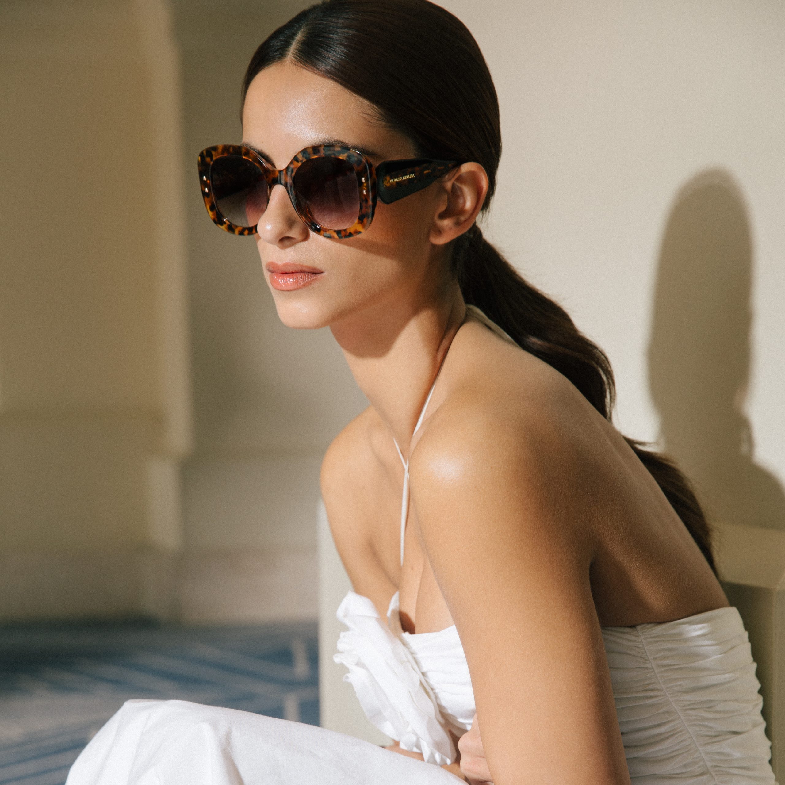 Las siluetas “House of Herrera” (HER 0254/S y HER 0255/S), disponibles en redondas oversize o cuadradas son reconocibles al instante gracias a las dos tachuelas metálicas redondas que flanquean las lentes, evocando uno de los motivos más icónicos de la marca, el estampado de lunares. Las varillas anchas son aún más llamativas, con bordes blancos en contraste, forma cónica y un medallón con el logotipo de Carolina Herrrera en bajorrelieve que remata los extremos. Con un estilo retro, pero totalmente moderno, estas gafas de sol son tan fabulosas como la moda que las inspiró.