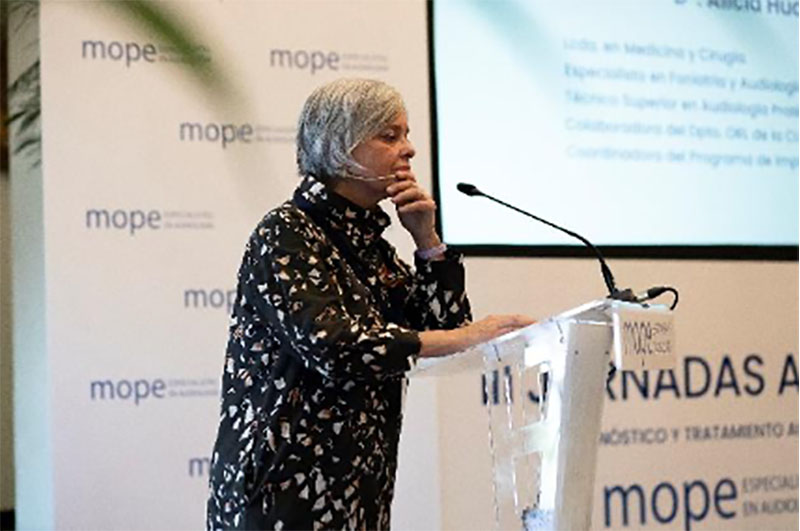 La Dra. Dª. Alicia Huarte Irujo,colaboradora del Dpto. ORL y coordinadora del Programa de Implantes Cocleares de la Clínica Universitaria de Navarra, trató de la importancia de escuchar precozmente. 34 millones de niños en el mundo sufren una pérdida auditiva discapacitante. Los programas de screening neonatal e intervención temprana y la implicación de los padres son fundamentales para minimizar las consecuencias. Analizó las distintas causas de la hipoacusia infantil y explicó estudios, comparativas y ejemplos de adquisición de lenguaje de niños según la edad a la que se realizó la intervención.