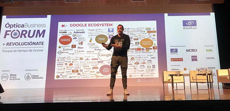 Por último JJ Delgado, Global Chief Digital Officer de Estrella Galicia y director de Amazon Marketing Services, Sur De Europa (2014-2017) fue introducido por Luis Elzaurdia, director general de Essilor. Delgado revisó en su ponencia los nuevos ecosistemas digitales, destacando que el video, como estímulo audiovisual, es la mejor herramienta que existe sobre la faz de la tierra para influenciar el comportamiento humano. “A día de hoy se están consumiendo cada día más de 4 billones de videos en YouTube. Esto lo convierte en el vehículo perfecto para conectar emocionalmente con el cliente. Compañías como Amazon, Facebook o Apple componen estos grandes ecosistemas digitales que se deben entender para poder adaptar a ellos tus modelos de negocio y convertirlos en aliados para vencer en la nueva era”, dijo. Delgado afirmó que la configuración de Amazon está definida para obtener un crecimiento exponencial: “Ha multiplicado por 3,3 veces su valor en los últimos tres años, pasando de 350 dólares a más de 1.700 dólares por acción. Sus ventas crecen cada cuatrimestre; es obvio que son quienes mejor entienden al cliente, y la nueva realidad, y por lo tanto deben servir de modelo para utilizarlo a nuestro favor. Amazon es el gran disruptor de la industria del retail”, afirmó. Sobre Looktic, JJ opinó que la asociación de ópticas es fundamental para poder dar coherencia al modelo y configurar proyectos cross a toda la industria, destacando el e-Commerce como una de las mejores herramientas para lograr este objetivo”, concluyó.