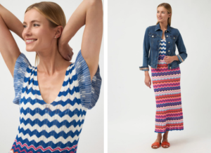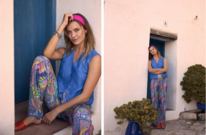 Color y comodidad para el día a día. El pantalón fluido de estampado multicolor es el gran protagonista, con un diseño lleno de movimiento y vitalidad. Se combina con un chaleco sin mangas en lino azul, que aporta estructura y equilibrio al conjunto.