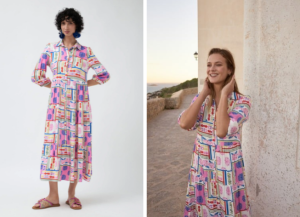 Un vestido alegre y relajado. Ligero, fluido y lleno de color, este vestido camisero estampado se convierte en el comodín perfecto para el verano. El estampado en tonos rosas, lilas y turquesas le da un aire fresco y alegre. Ideal para llevar con sandalias planas durante el día o con alpargatas para un look de tarde, es una prenda que funciona igual de bien en la ciudad que frente al mar.