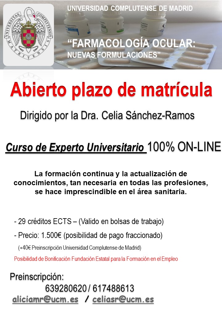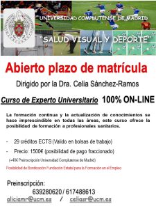 La Universidad Complutense de Madrid, después de más de 10 ediciones, abre una nueva matrícula del curso Salud Visual y Deporte. Asimismo se ha abierto el plazo de matrícula de una nueva edición del curso de Experto Universitario en Farmacología Ocular: Nuevas Formulaciones. Ambos cursos serán dirigidos e impartidos por la Doctora Celia Sánchez-Ramos y el plazo de inscripción es hasta el 31 de diciembre.