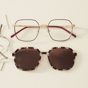 Eco Eyewear también presenta la nueva pieza estrella, Chia. Elija entre las variantes de color Light Gold, Black Rose Gold, Aqua/Gold y BurgundyCopper, cada una con una combinación diferente de acabados metálicos brillantes y mates en la montura y la patilla. Además, los clips magnéticos a juego están disponibles para ayudarle a añadir aún más volumen y expresión visual a su look.