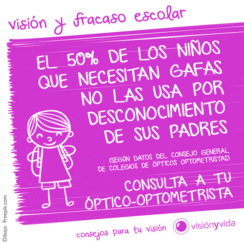 FrcasoEscolar-03La asociación Visión y Vida lanza una campaña para concienciar a los padres de la importancia de llevar a sus hijos a una revisión visual previa a la vuelta al colegio, aunque no se haya percibido ninguna anomalía. Antes de la vuelta al cole, o al comienzo del mismo, es imprescindible revisar el estado de la visión de los menores acudiendo al óptico-optometrista, máxime si tenemos en cuenta que uno de cada tres casos de fracaso escolar se relaciona con problemas de mala visión; de hecho, el 50% de los niños que necesitan gafas no las usa porque sus padres desconocen sus problemas visuales.