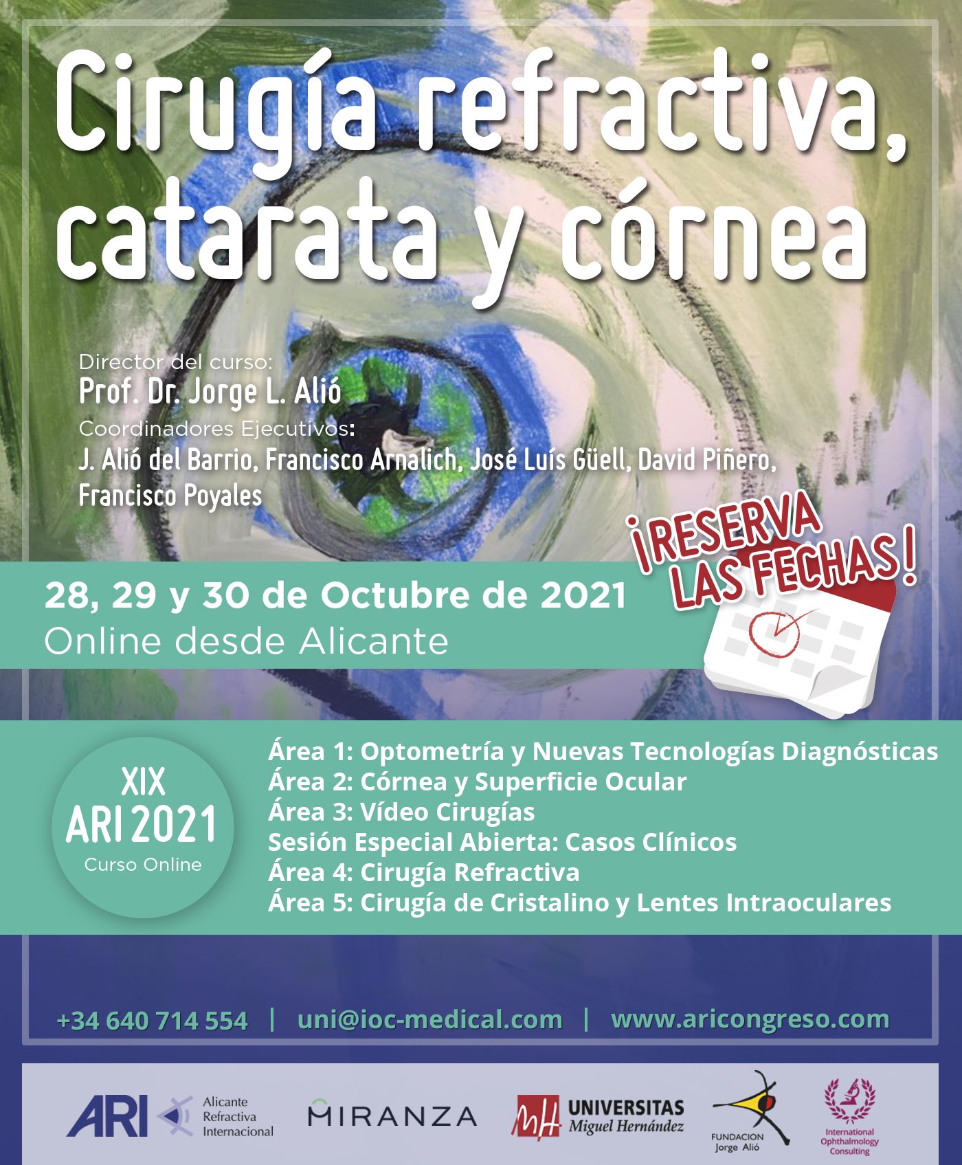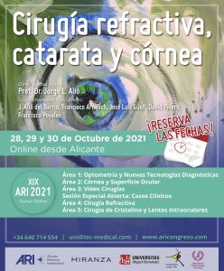El XIX Congreso Alicante Refractiva Internacional (ARI) se pone en marcha con la apertura del plazo de inscripción del curso online ‘Cirugía refractiva, catarata y córnea, que dirige el doctor Jorge Alió y cuenta con más de 75 expertos mundiales. Es una oportunidad única para que los oftalmólogos descubran lo más novedoso en las áreas de ciencias de la visión. Esta nueva edición se amplía un día más para incluir una sección especial sobre optometría y tecnología diagnóstica y terapéutica. Se trata de una jornada orientada a la optometría clínica y a la presentación de las novedades en tecnología aplicada a la subespecialidad de cirugía refractiva, catarata y córnea, que se celebrará el día 28 por la tarde. Así, el 28, 29 y 30 de octubre desde Vissum Instituto Oftalmológico de Alicante (Grupo Miranza) se desarrollará un evento con más ponentes, sesiones científicas y casos clínicos.