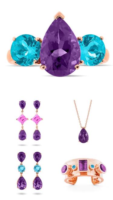 Con el color violeta como protagonista, gran embajador del feminismo, Paloma Lumbreras ha creado una cuidada selección de joyas (anillos, pendientes, un brazalete y un colgante) que combinan la Amatista con oro, diamantes y topacios azules para dar como resultado una colección atrevida, libre y con carácter.