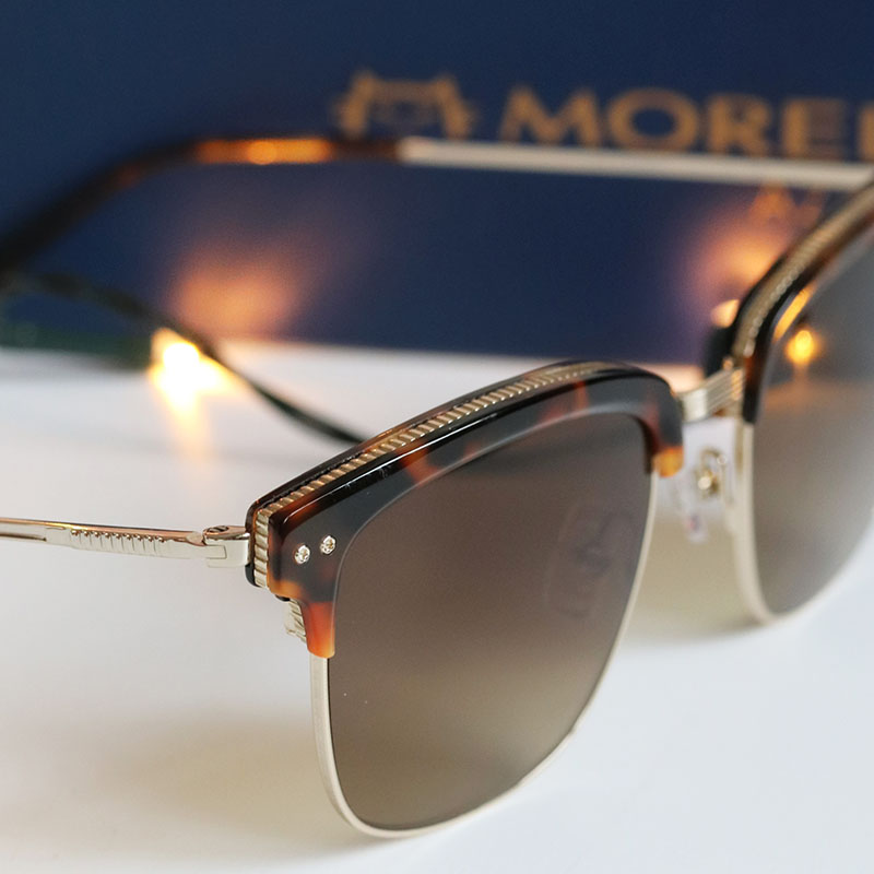Para los fanáticos de la tendencia retro, Morel ofrece gafas de sol inspiradas en monturas combinadas de los años 50. Este complemento perfecto completará tu look con su arco guilloché dorado, que se encuentra entre acetato jaspeado.