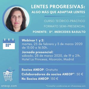 La Asociación Nacional de Empresarios de Óptica y Profesionales –ANEOP– organiza el curso “Lentes progresivas: algo más que adaptar lentes”. Impartido por Dª Mercedes Basulto, se realizará por medio de dos sesiones webinar y una sesión presencial durante las IV Jornadas Anuales ANEOP que tendrán lugar en el hotel Spa “La Princesa”, en Alcorcón (Madrid), el 28 de marzo. Por su parte, el primer webinar se celebra este 25 de febrero y el segundo el 3 de marzo.