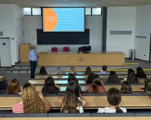 Blanca Fernández, decana-presidenta del COOOA, acudió a la presentación del máster en representación del colegio profesional, donde asistió a la conferencia inaugural impartida por el doctor Antonio Ucedo Montañés. En ella, el oftalmólogo ofreció a los asistentes diferentes aspectos relacionados con la cirugía refractiva, entre los que se encontraban la decana de la Facultad de Farmacia, María Álvarez de Sotomayor Paz; la coordinadora del MUOCCA, Mª del Carmen Sánchez; alumnos y profesorado.