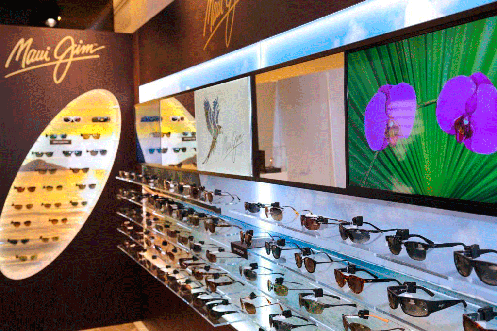 Para atraer clientes a las tiendas de un modo visual, disponen de un expositor esquinero de pared, con una iluminación brillante, con grandes espejos, imágenes llamativas y pantallas de vídeo que dan vida a las gafas de sol Maui Jim. En la esquina de la pared hay un expositor espectacular ladeado y ovalado que recuerda a las tablas de surf, representativas de las islas hawaianas, donde se crearon las primeras Maui Jim.