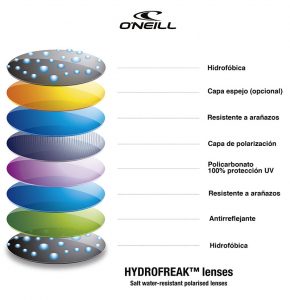 O’Neill presenta las lentes Hydrofreak™, que constan de filtros polarizados de alta calidad sellados y protegidos contra daños mediante la adición de una capa hidrofóbica repelente, un revestimiento antirreflejante en la parte posterior resistente a los arañazos y policarbonato resistente a los impactos. Las lentes Hydrofreak™ también brindan una gran claridad visual: eliminación de halos, mayor contraste y colores más reales. Todas las monturas O’Neill están equipadas con lentes mejoradas de protección UV400 UVA y UVB frente a la radiación solar.