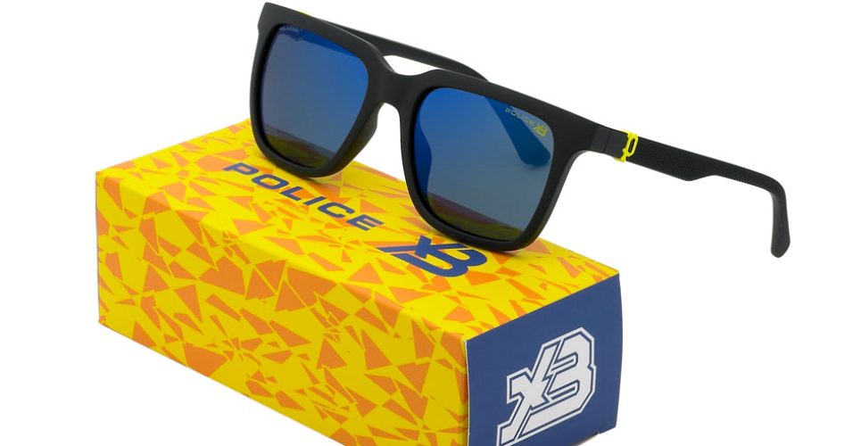 Los colores azul y amarillo de la equipación se reflejan en las lentes polarizadas espejadas azules, un detalle icónico de la marca, personalizadas con el logotipo Police XB amarillo como la P en las varillas.