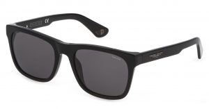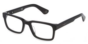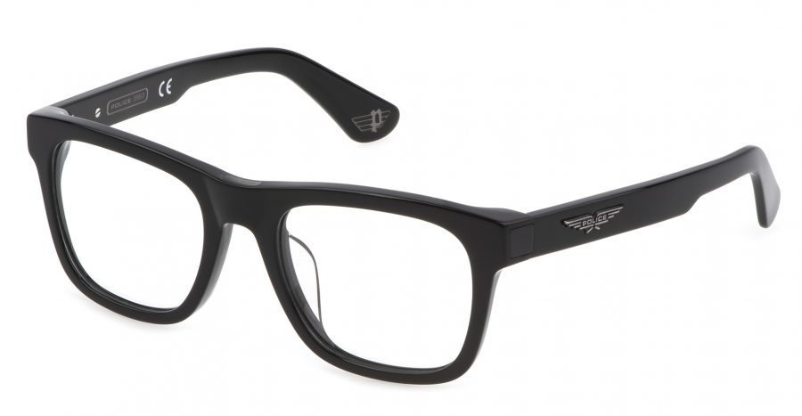Origins Bullet 1 VPLE37 col.700. Modelo realizada por Police para el personaje de Ladybug, interpretado por Brad Pitt en «Bullet Train». Gafas de vista en acetato negro brillante con grandes grosores, frente cuadrado y decidido y varillas decoradas con el icónico logotipo de Police en forma de águila de inspiración noventera. También disponible con montura de acetato transparente y núcleo de las varillas a la vista.