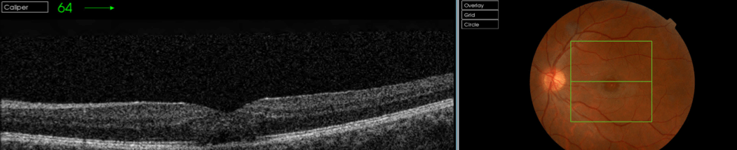 Actualmente podemos caracterizar las lesiones mediante las pruebas de imagen que aportan valoración cuantitativa y cualitativa. Es interesante, adicionalmente a la exploración funduscópica estudiar las lesiones mediante retinografía, OCT, angio-OCT, autofluorescencia, microperimetría y oftalmoscopía láser confocal(SLO). Todas ellas aportan información complementaria en el estudio, diagnóstico y seguimiento de las lesiones. A continuación se muestran retinografías y OCTs de un caso de retinopatía solar y un agujero macular producido por la acción de un láser en una discoteca ( Figuras 1,2,3,4)