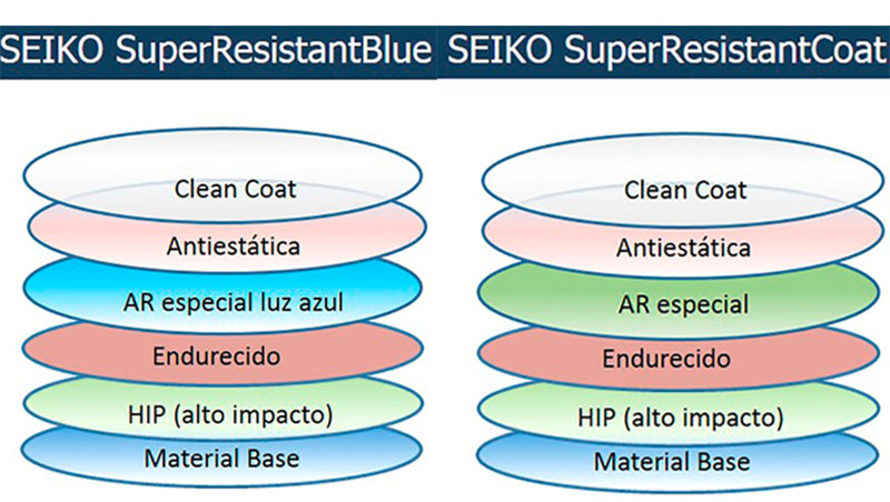 erentes de sus respectivos tratamientos de origen. SRC ofrece una alta transmitancia combinada con capas repelentes a agua, grasa y partículas de suciedad y con una mayor protección contra los daños físicos. SRB aúna todas esas características más la inclusión de protección contra la luz azul nociva, la luz que emiten las pantallas de los dispositivos digitales. La protección UV en cara posterior se extiende a todos los productos y materiales SEIKO, estando disponible en índices 1.50/1.60/1.67/1.74 y en todos los diseños: monofocales y progresivos. Excepción hecha para la línea de productos SEIKO INDOOR, lentes cuyo uso es específico para entornos de interior donde el riesgo a una exposición a la radiación UV es ínfima.