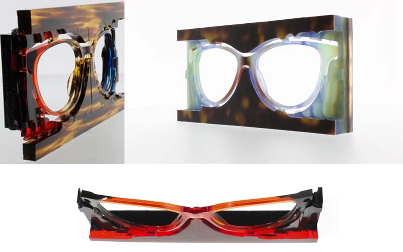 Esta técnica le permite cortar las monturas a partir de una plancha de 20-22 mm compuesta por múltiples capas de acetato, combinadas según el diseño del estilista. En primer lugar, desde un punto de vista estético, esta plancha permite la combinación y FUSIÓN con un proceso mecánico y sin la utilización de pegamentos o ácidos, de innumerables texturas y colores, creando efectos visuales extraordinarios (Thema-Optical tiene más de mil colores diferentes): las distintas capas de color se ven a lo largo de la curvatura de las gafas, creando asimetrías cromáticas particulares. Además, a través de la técnica 3D, las gafas se esculpen y se crean inmediatamente con la curvatura necesaria para cada rostro. Esto ofrece numerosos beneficios en comparación con la producción normal, donde las monturas salen planas y deben calentarse para doblarse, lo que afecta su resistencia y las condiciona a deformarse con el paso del tiempo.
