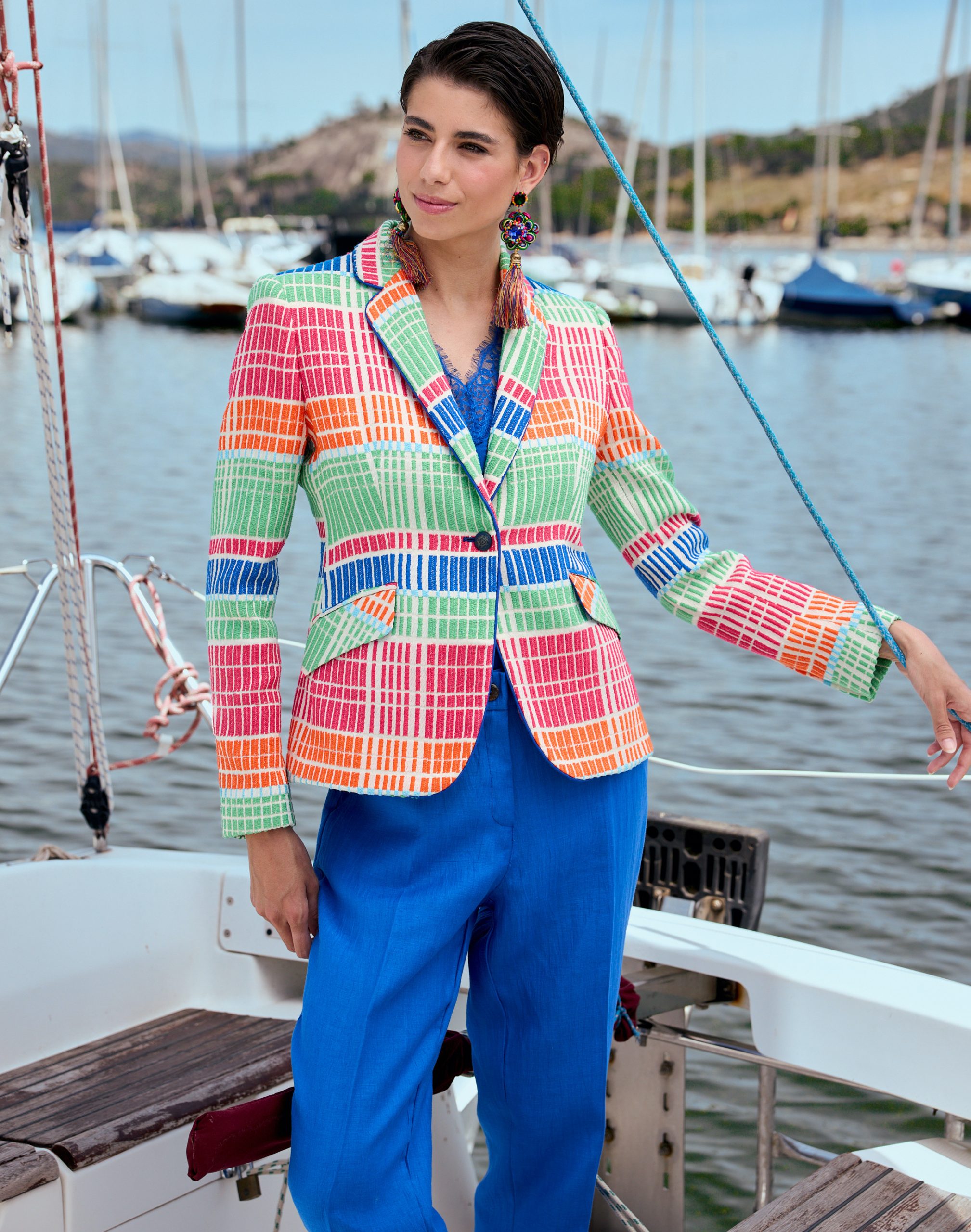 La naturaleza y la vitalidad se reflejan en este look, donde el verde es el protagonista. El pantalón de estampado geométrico en tonos verdes y amarillos aporta un aire fresco y desenfadado, combinado con una blusa blanca sin mangas de corte entallado y detalle de volante plisado en la tapeta. La americana de tweed en amarillo equilibra el conjunto con un toque estructurado y luminoso.