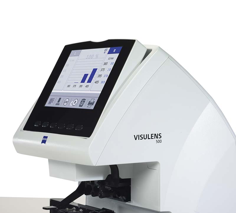 Además, el VISULENS 500 cuenta con un sistema de medición de la transmisión de radiación UV avanzado que emplea hasta cuatro longitudes de onda (365, 375, 395, 405 nm). El resultado de las mediciones reforzará la confianza en su óptico del paciente, ayudando así a fidelizar las sucesivas visitas. Además, si comprueba cualquier lente transparente de ZEISS, podrá asegurar al cliente que su elección le va a proteger de manera total de la radiación UV.