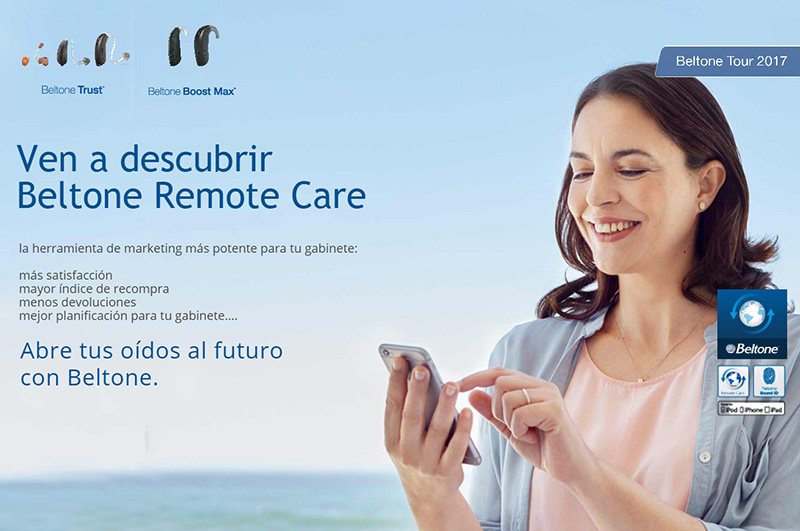 En esta ocasión, además de mejoras audiológicas diseñadas para favorecer la calidad de vida de los usuarios, sin limitaciones en el mundo digital, y siempre en la dirección de favorecer la comunicación en todos los sentidos de las personas, el equipo Beltone presenta la tecnología Remote Care, un sistema desarrollado por la firma danesa que hace saltar la última barrera que quedaba entre la ayuda auditiva y el paciente: la distancia. Gracias a Remote Care, el audiólogo puede lograr un grado de fidelización hasta ahora nunca visto en el mercado.