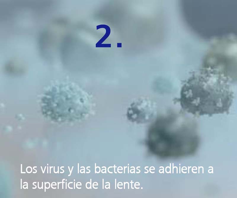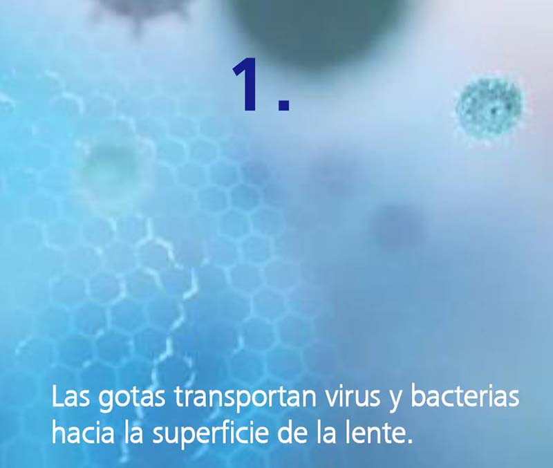 Las lentes oftálmicas son superficies de alto contacto. Pueden acumular virus y bacterias y contaminarse fácilmente mediante el contacto directo o la dispersión de gotas.